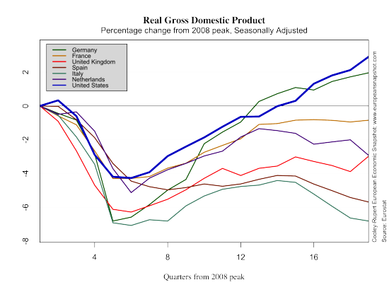 In earlier posts we presented GDP for several countries and the U.S. (presented below for reference), the data showed that the U.S. and Germany looked very similar in terms of their bounce-back from the Great Recession others have not fared as well.