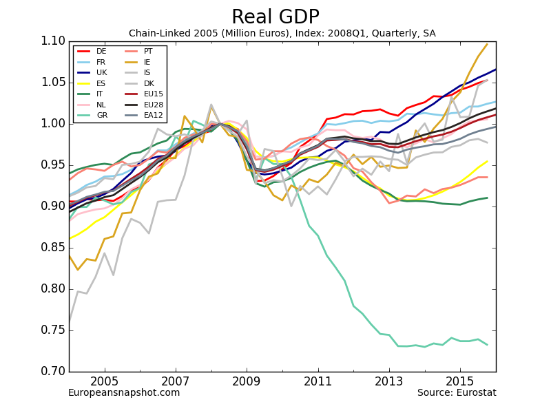 Overall, the tragedy of Greece does not seem to be impeding a gradual European recovery. Although the countries are improving at very different paces, the fact that growth has returned more broadly has damped a lot of the dire speculation about the future of the EU. Global concerns will shape much of the outlook for the Eurozone going forward, but the data suggest that most economies in the EU have returned to growth, with larger economies having exceeded their pre-recession levels of output, while the peripheral economies have begun to show signs of recovery.